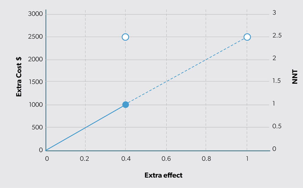One of the main summary statistics used in CEA is the incremental cost-effectiveness ratio (ICER), the ratio of the extra cost (ΔC) to the extra effect (ΔE). In our example, the ICER = ΔC/ΔE = $1000/0.4 more successes or $2500 per additional success. Alternatively, the ICER can be calculated as the product of ΔC and NNT, labeled “costs of additional treatment success” (COATS) by Weiss et al.10 Calculated this way, the ICER equals $1000 x 2.5 = $2500 for one more success. Thus, whether you divide extra cost by extra effect (ΔC/ΔE) or multiply extra cost by NNT (ΔC x NNT), you get the same result for your economic evaluation.
