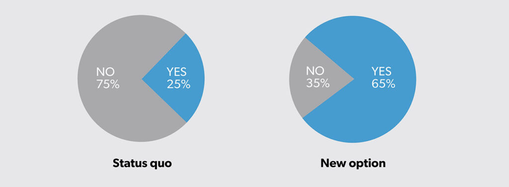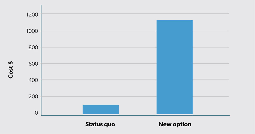 The new option has greater expected costs (i.e., $1100 − $100 = $1000 more). However, the new option is also more effective, with an expected success rate of 65% (40% more than the status quo at 25%).