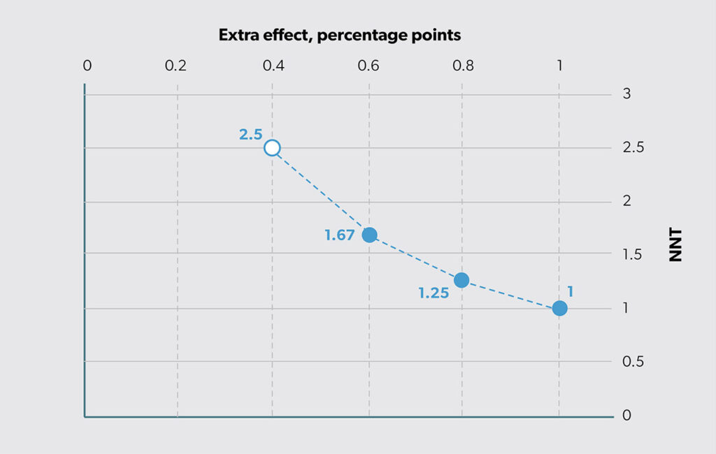 Another way to summarize this effect difference is by looking at “number needed to treat” (NNT).8 Cordell9 states, “NNT provides a clinically useful ‘yardstick’ of the effort required to have a beneficial outcome or prevent a bad outcome with a therapy.” To compute NNT, we first calculate the difference in percentages (i.e., 65% − 25% = 40%) and then take its reciprocal (i.e., 1/40% = 2.5). Based on this finding, we can say that we need to use the new option in place of status quo for three people to achieve one additional success. Thus, effectiveness can be reported either as a straight difference or as the reciprocal of that difference (as NNT). The relationship between extra effect (ΔE) and NNT is shown in Figure 3. The open circle shows that the estimated ΔE = 0.4 on the horizontal axis is the same as NNT (1/0.4 = 2.5 on the vertical axis).